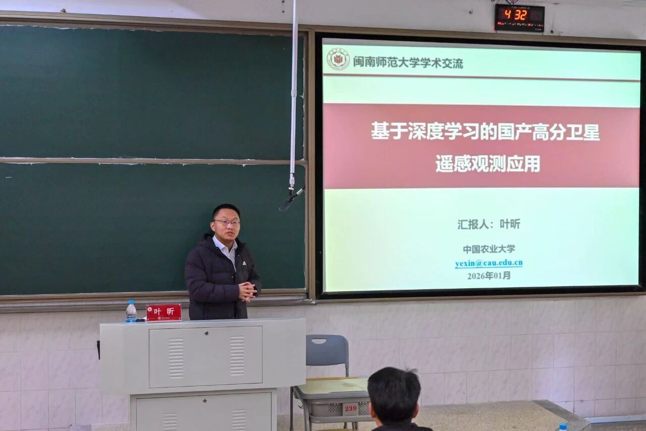 1月9日,中国农业大学信息与电气工程学院副教授叶昕应我院邀请,于圆山旧教学楼107汇报厅,开展题为“基于深度学习的国产高分卫星遥感观测应用”学术讲座,讲座由院长助理潘大东主持。叶昕以遥感对地观测动态变化为切入,引导大家直观感受高分卫星应用能力,帮助建立对遥感技术的初步认知。随后,梳理了遥感技术的发展脉络,简要介绍了卫星遥感的工作原理,并针对我国高分卫星遥感影像分类及遥感信息提取技术展开深入阐释。叶昕指出,在人工智能训练方面,可利用元学习技术摆脱对海量样本的强烈依赖,提升模型自适应能力,助力突破多源数据融合等关键难题,以完善基端到端特征级融合框架的构建。