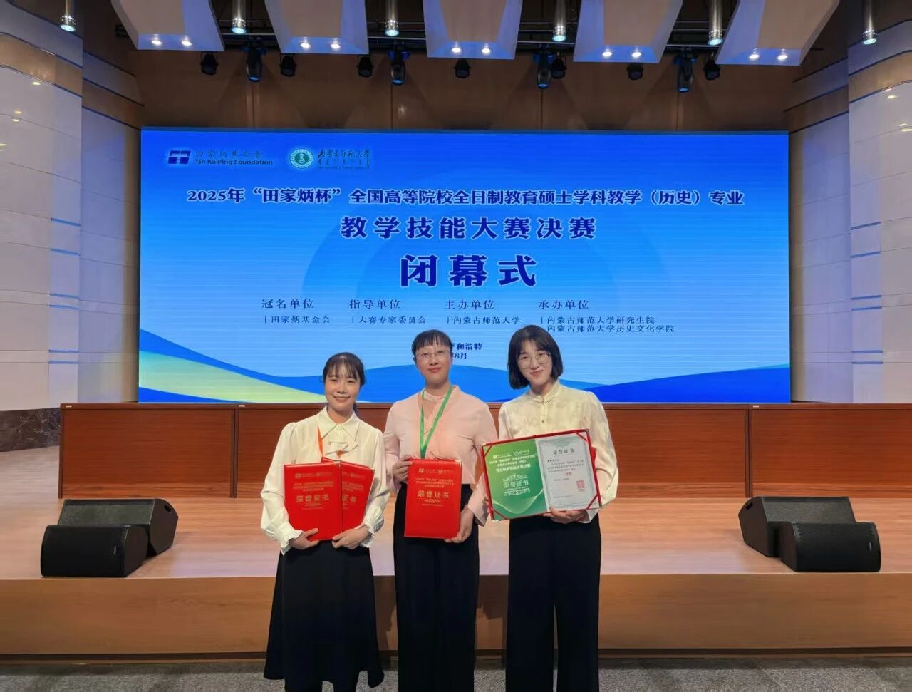 8月22日至25日,经过多轮激烈比拼,2025年“田家炳杯”全国高等院校全日制教育硕士学科教学(历史)专业教学技能大赛决赛于内蒙古师范大学圆满收官。我院研究生雷欣怡凭借出色的综合表现,荣获一等奖及优秀教学设计奖;廖丹获得三等奖及优秀教学设计奖;陈惠兰老师获评全国优秀指导教师奖。
