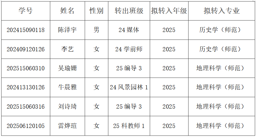 根据《闽南师范大学普通本科生转专业管理办法》(闽南师大[2022]60号)文件及《闽南师范大学历史地理学院转专业工作方案(2025-2026学年)》文件精神及方案要求,本着公开、公正、公平的原则,经学生个人报名、笔试与面试考核,经学院教学指导委员会审议、党政联席会议研究,拟录取陈泽宇等2位同学转入历史学(师范)专业,拟录取吴瑜姗等4位同学转入地理科学(师范)专业,现予以公示。若对陈泽宇等6位同学转专业有异议,请在公示时间内电话或书面向历史地理学院教务科反映,联系电话:0596-2591449。